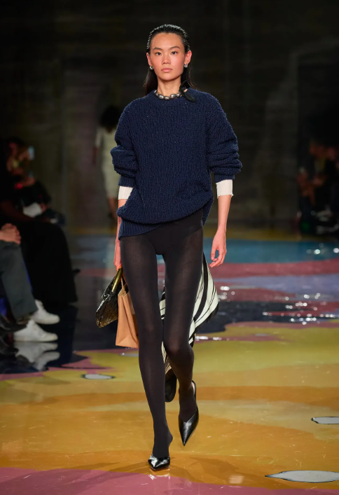 Una las tendencias de moda de 2022 para probar en la vida real –porque, seamos sinceras, es poco probable que veamos esta propuesta de estilo sin falda y pantalón extendido– es la que Raf Simons llevó a la pasarela: una camisa y un suéter largo, combinados con unos leggings (en este caso de lunares).